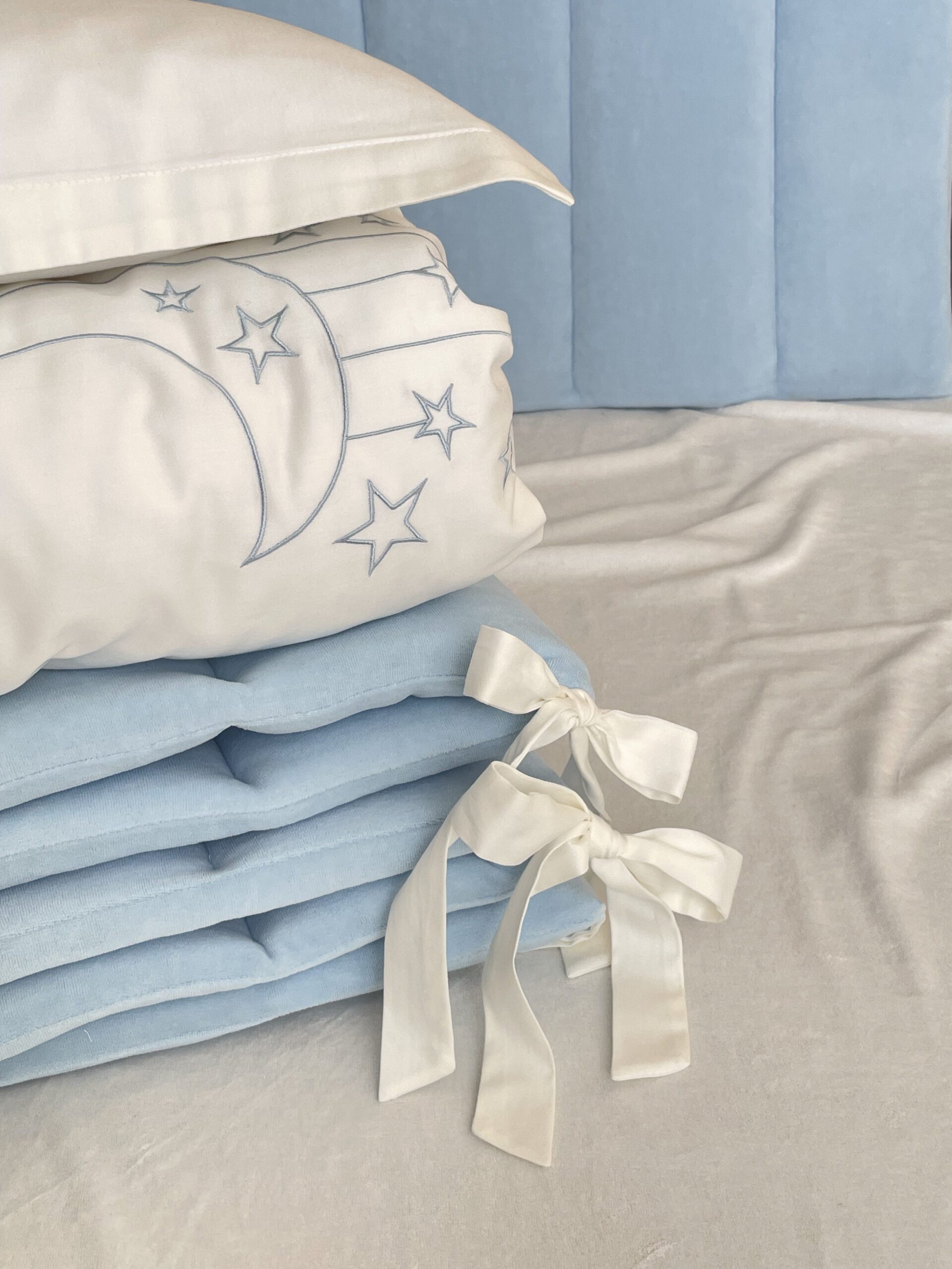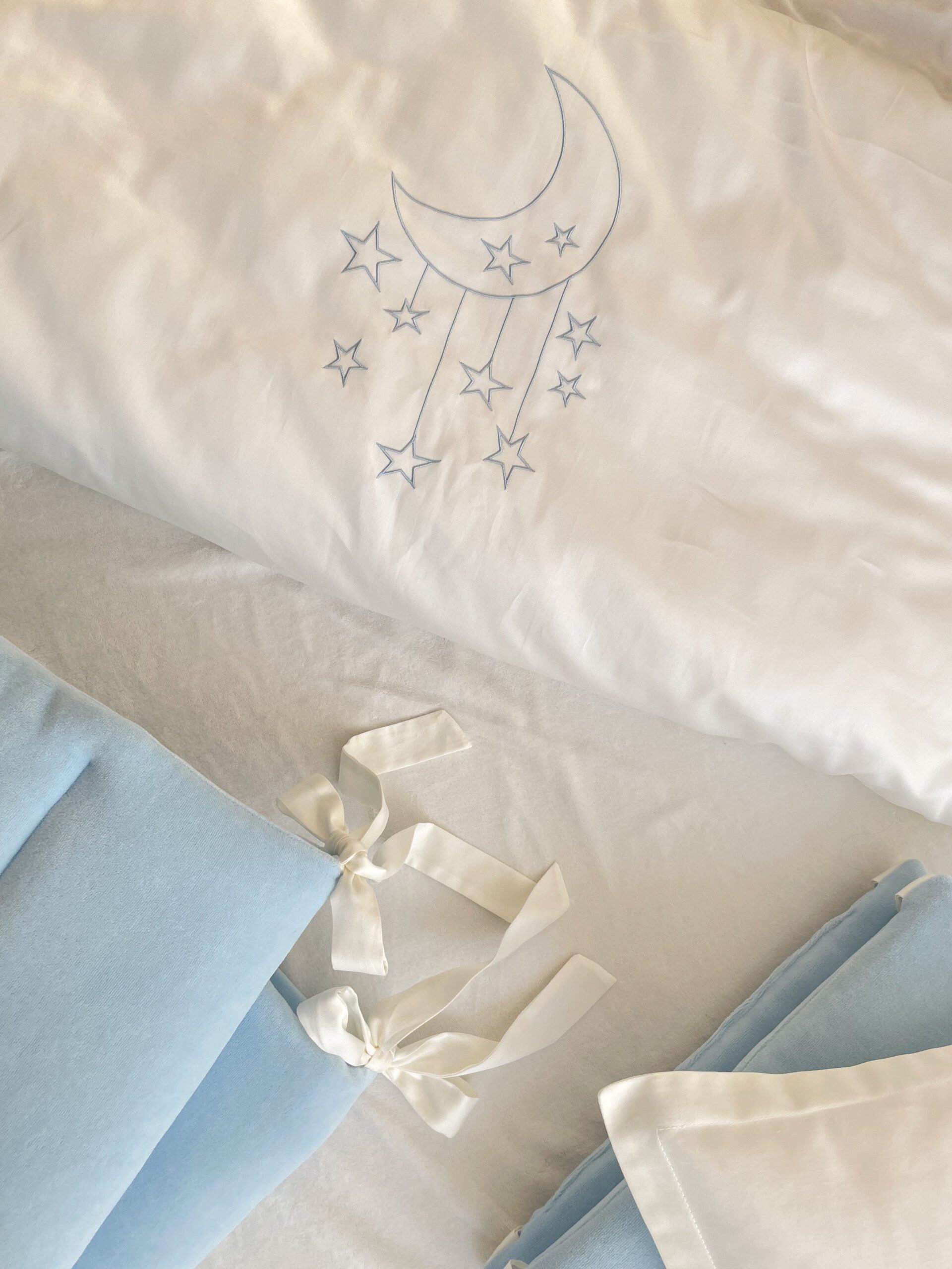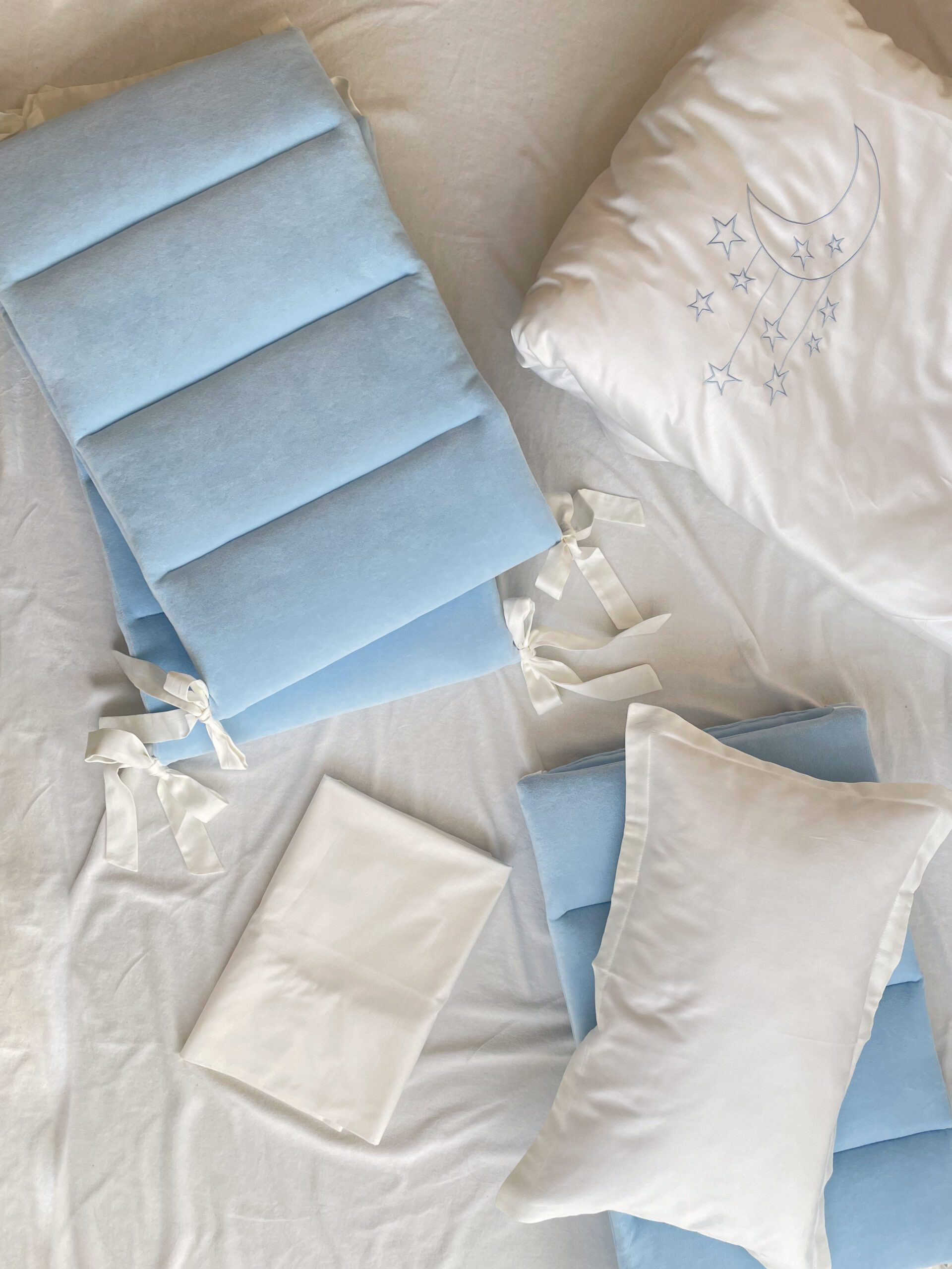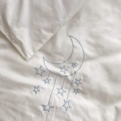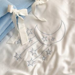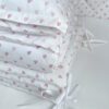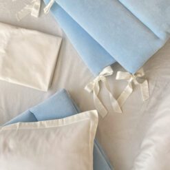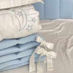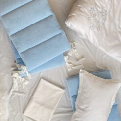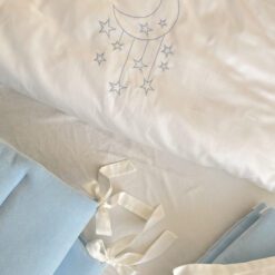 Setul din 6 unități a îmbinat 2 tipuri de stofă, pentru a echilibra aspectul pătuțului. Apărătorii de catifea, vor păstra senzația de căldură și vor oferi un aspect delicat locului de somn al celui mic. Lenjeria din bumbac satinat este cea mai potrivită stofă pentru bebeluși, e inofensivă, naturală și plăcută ca atingere. Broderia fină și liniștită, se încadrează perfect ăîn orice tip de anturaj.