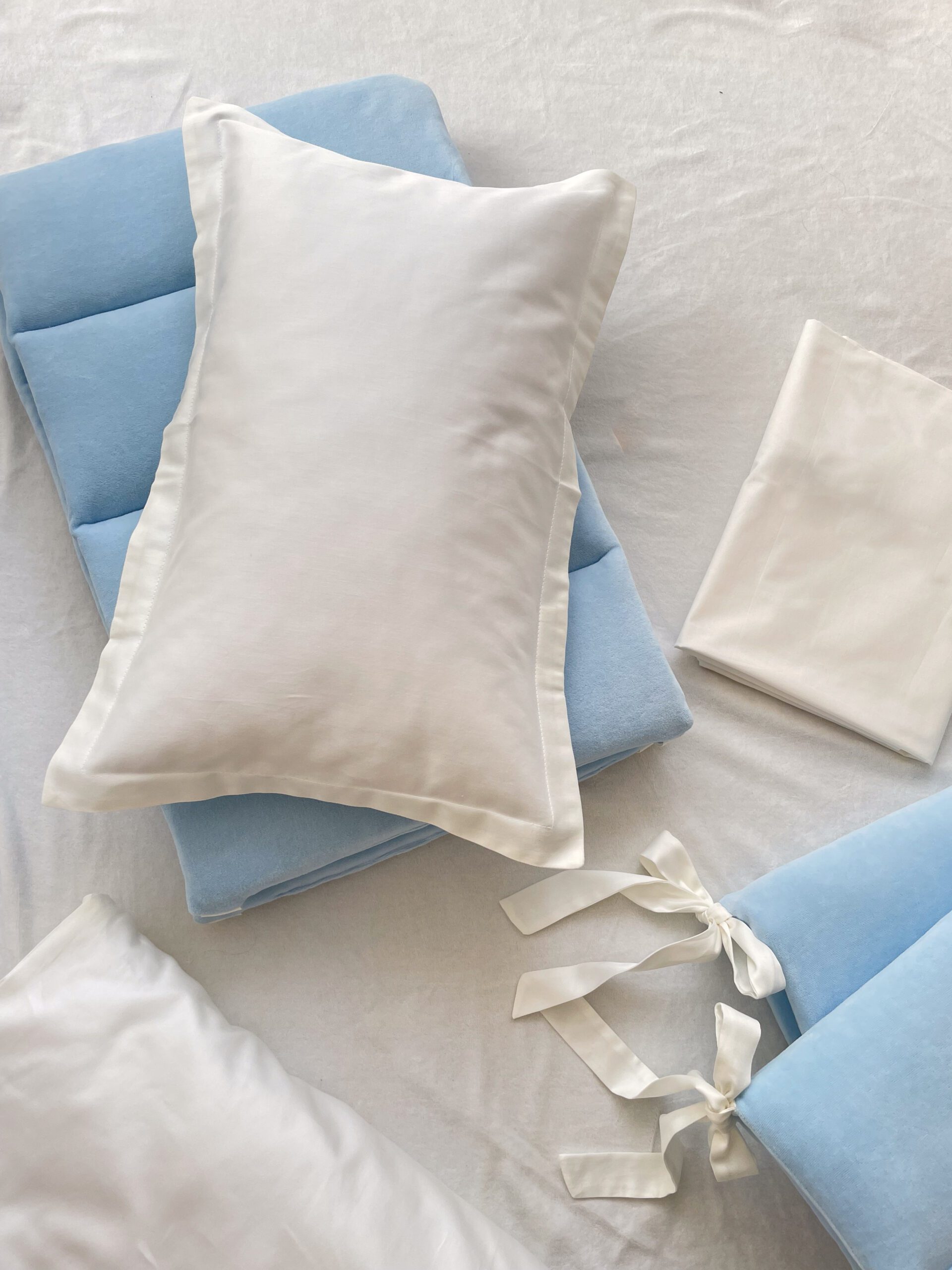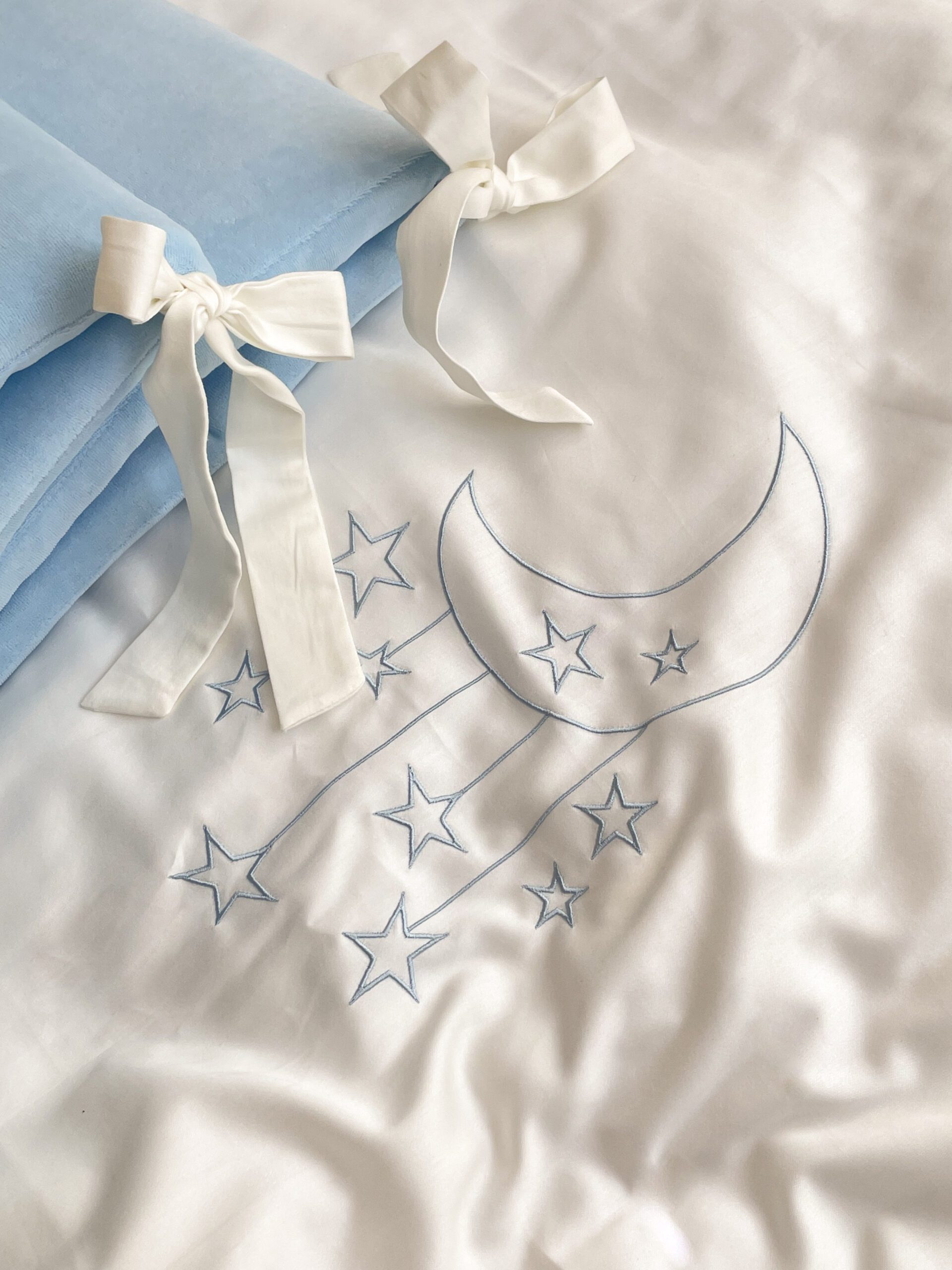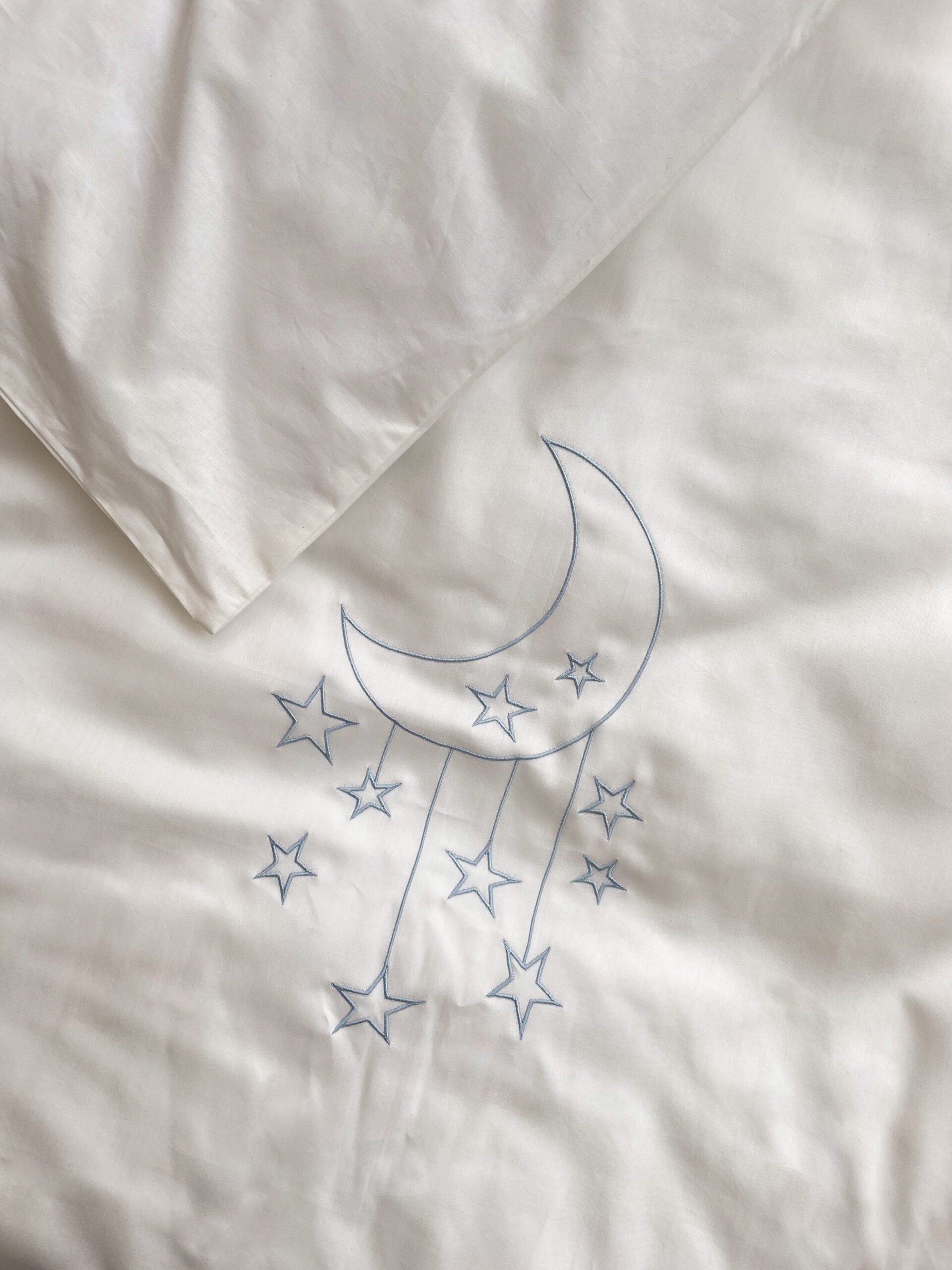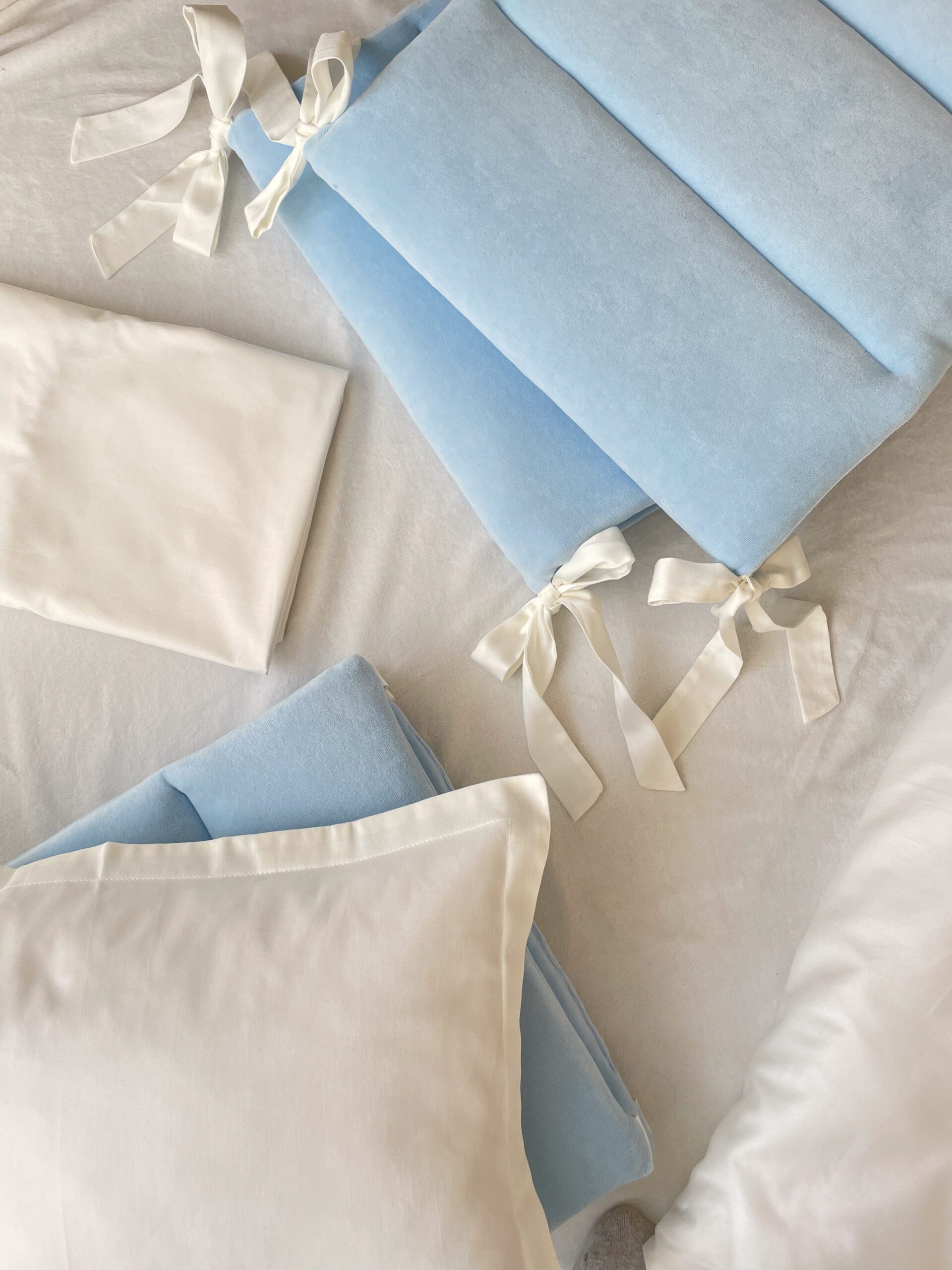 Setul din 6 unități a îmbinat 2 tipuri de stofă, pentru a echilibra aspectul pătuțului. Apărătorii de catifea, vor păstra senzația de căldură și vor oferi un aspect delicat locului de somn al celui mic. Lenjeria din bumbac satinat este cea mai potrivită stofă pentru bebeluși, e inofensivă, naturală și plăcută ca atingere. Broderia fină și liniștită, se încadrează perfect ăîn orice tip de anturaj.
