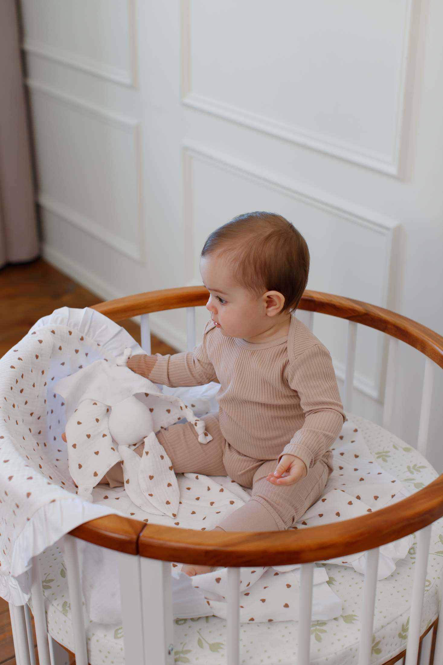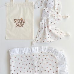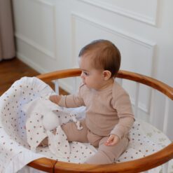 - Textura plăcută: Cuvertura cu falduri și jucăria comforter sunt fabricate din muselină, un material care devine mai moale și mai plăcut la atingere cu fiecare spălare. Această textură plăcută este reconfortantă pentru pielea sensibilă a bebelușului.