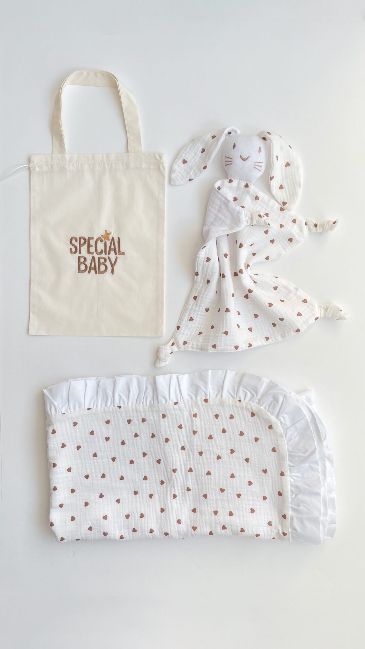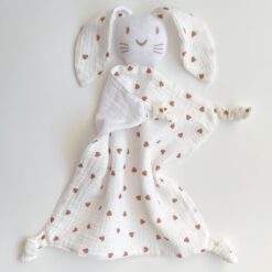 Un set din cuvertură de muselină cu falduri în 2 straturi și jucăria comforter pentru bebeluși ofera: