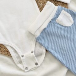 Set compus din body cu mâneci lungi, cu mănuși incorporate; o pereche de colanți din bumbac. Body cu capse duble între picioare pentru mai mult confort și pentru a putea fi ajustați la o mărime mai mare. Colanți cu bordură foarte lată în talie, ce poate fi pliată pe măsură ce copilul crește. Colanții au talpa acoperita la mărimea 0-3 luni; de la 3-6 la 9-12 luni, sunt fără talpă, tip: leggings, cu îndoietură, pentru a putea fi alungiți, în dependență de necesitatea bebelușului.