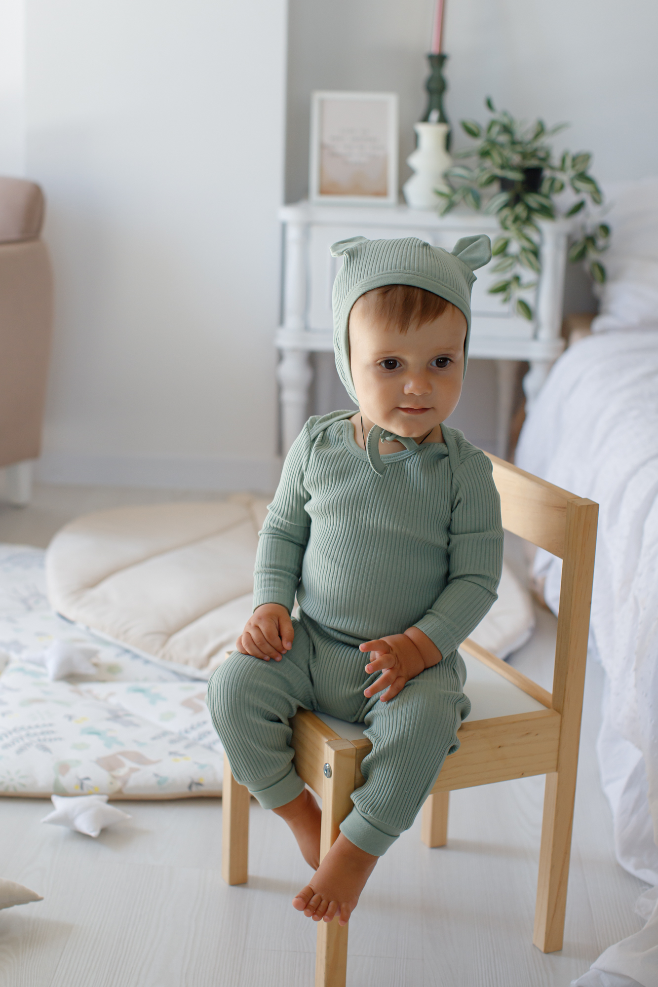 Set compus din body cu mâneci lungi, cu mănuși incorporate; o pereche de colanți din bumbac. Body cu capse duble între picioare pentru mai mult confort și pentru a putea fi ajustați la o mărime mai mare. Colanți cu bordură foarte lată în talie, ce poate fi pliată pe măsură ce copilul crește. Colanții au talpa acoperita la mărimea 0-3 luni; de la 3-6 la 9-12 luni, sunt fără talpă, tip: leggings, cu îndoietură, pentru a putea fi alungiți, în dependență de necesitatea bebelușului.