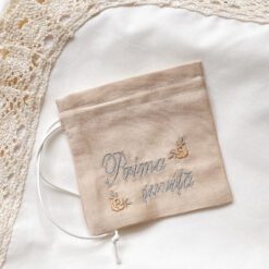 - punguța „Prima șuviță”: O pungă din satin, cu șiret la bază, creată pentru a păstra în timp amintirea despre sarbătoarea de încreștinare a bebelușului, broderia sugestivă face ca aceste element al setului să fie elegant și draguț;