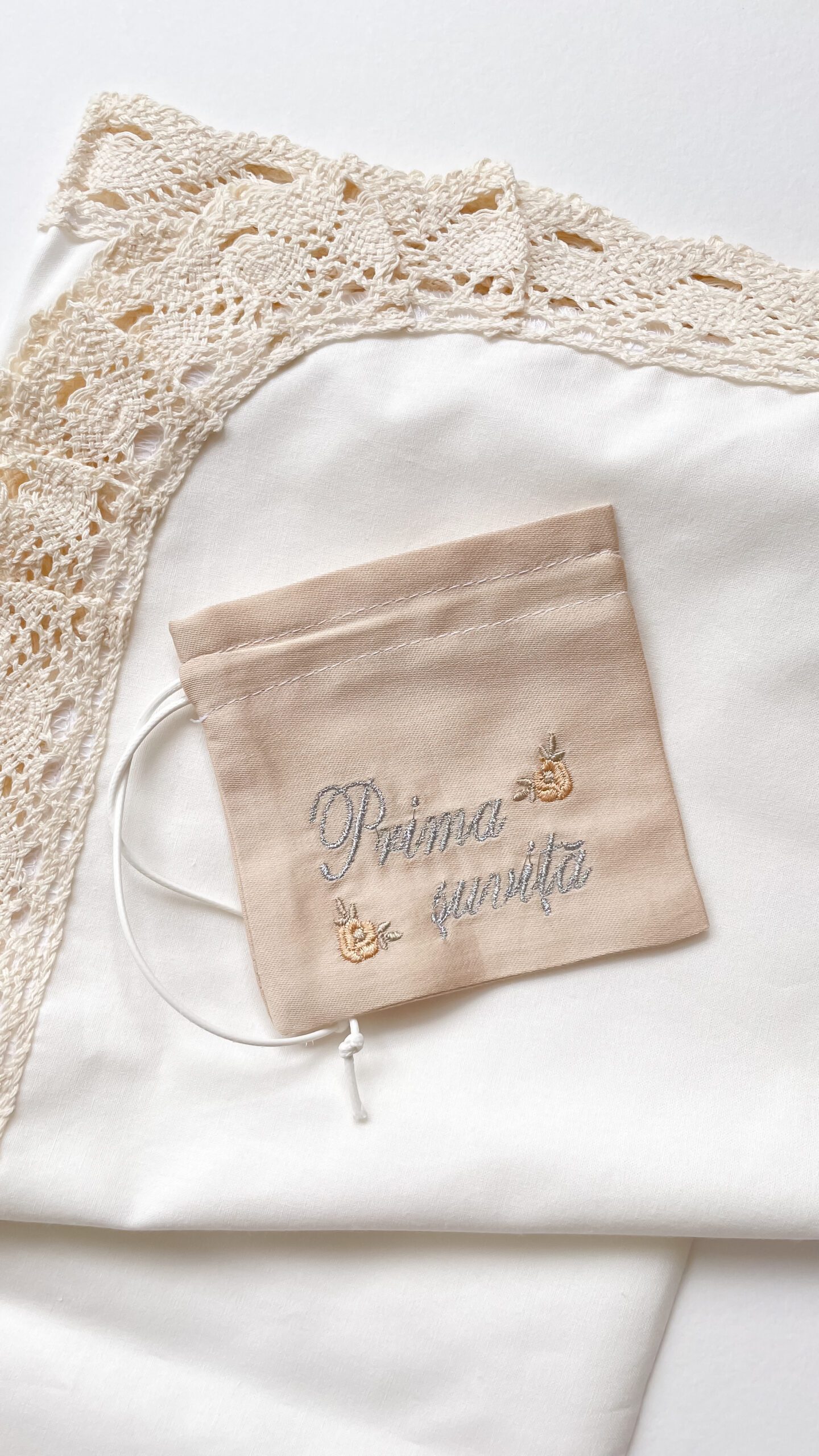 - punguța „Cruciuliță”: O pungă din bumbac satinat, creată pentru a păstra cruciulița primită de bebe la botez.