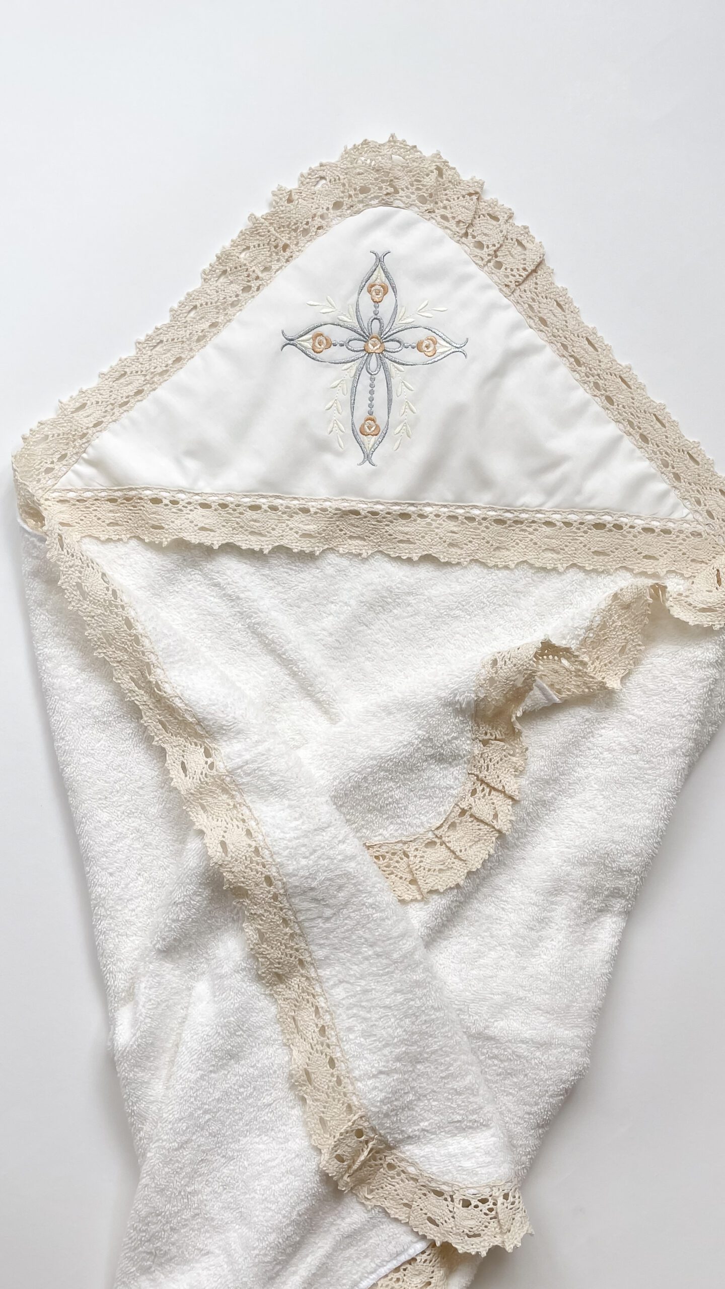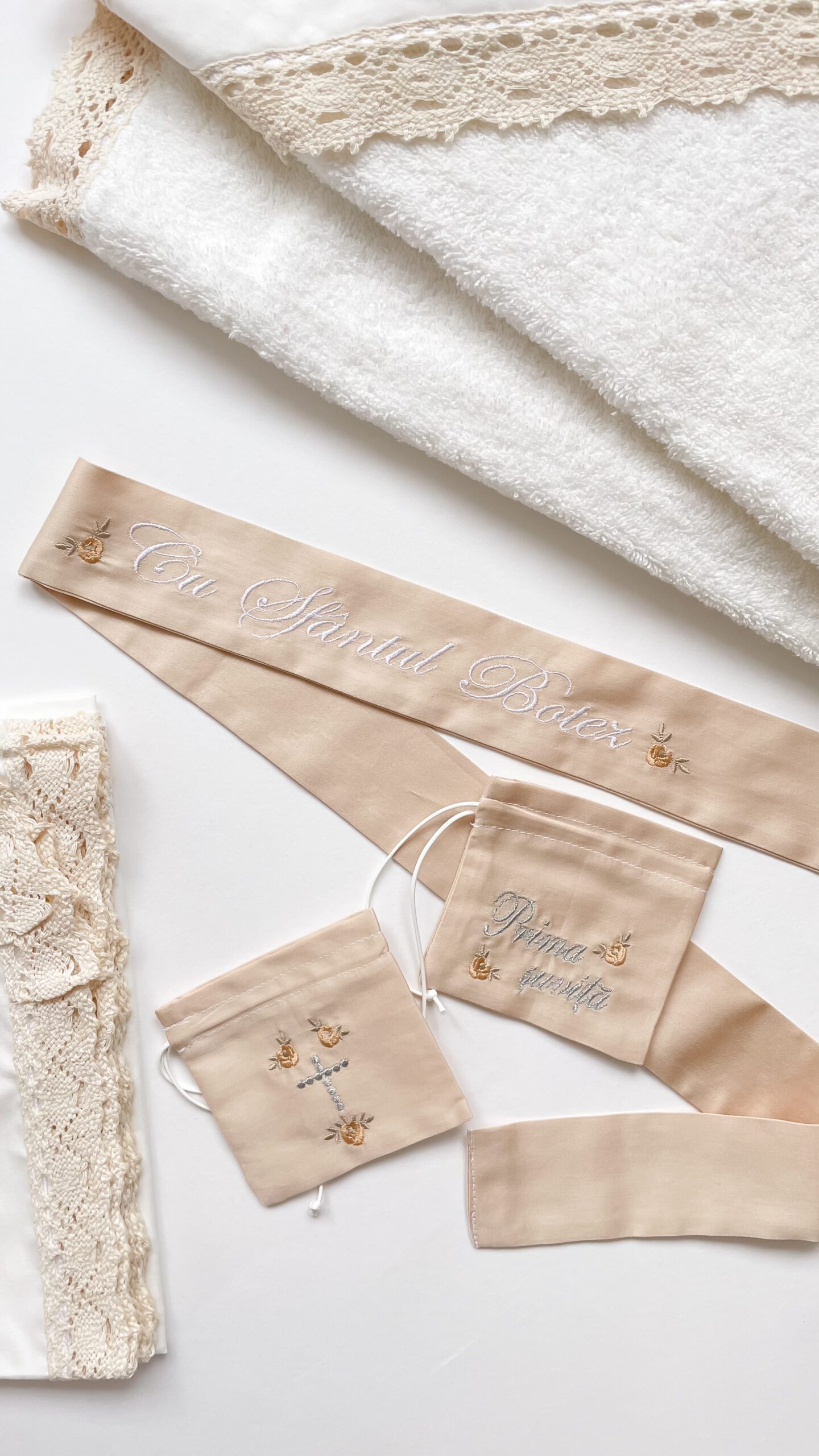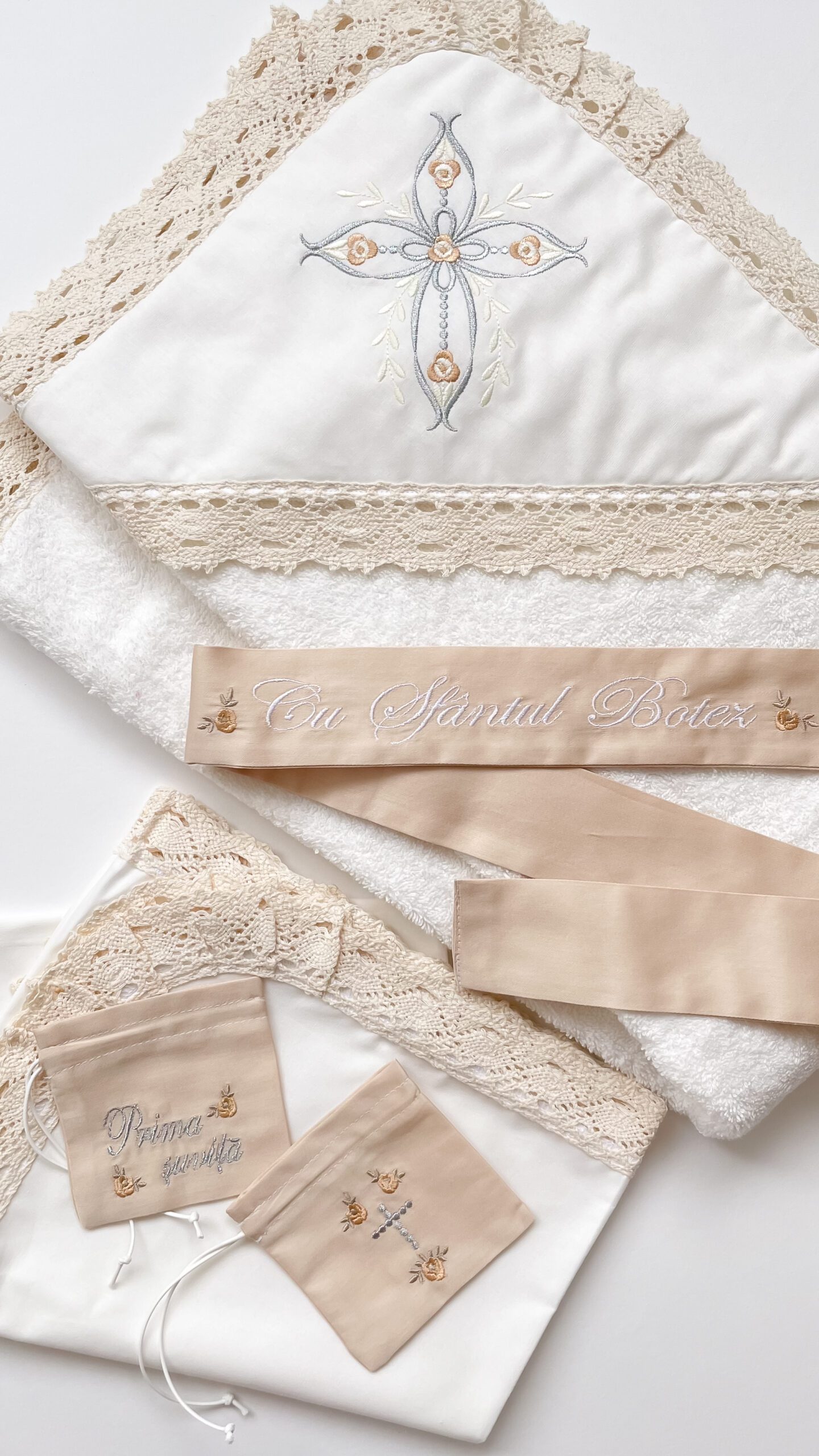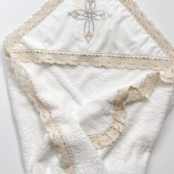 - prosop de botez: Un prosop frumos decorat și brodat special pentru a înfășura bebelușul după ceremonie. Elementele de decor oferă o doză de eleganță și sărbătoare prosopului. Acesta are mărime de 90*90 cm, pe colț e atașată o glugă-colț, creată pentru a face mai confortabilă scoaterea din apă a bebelușului, astfel pastrînd căldura corpului. Broderia fină și dantela de bumbac transmite mesajul tematic al botezului;