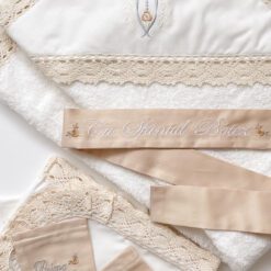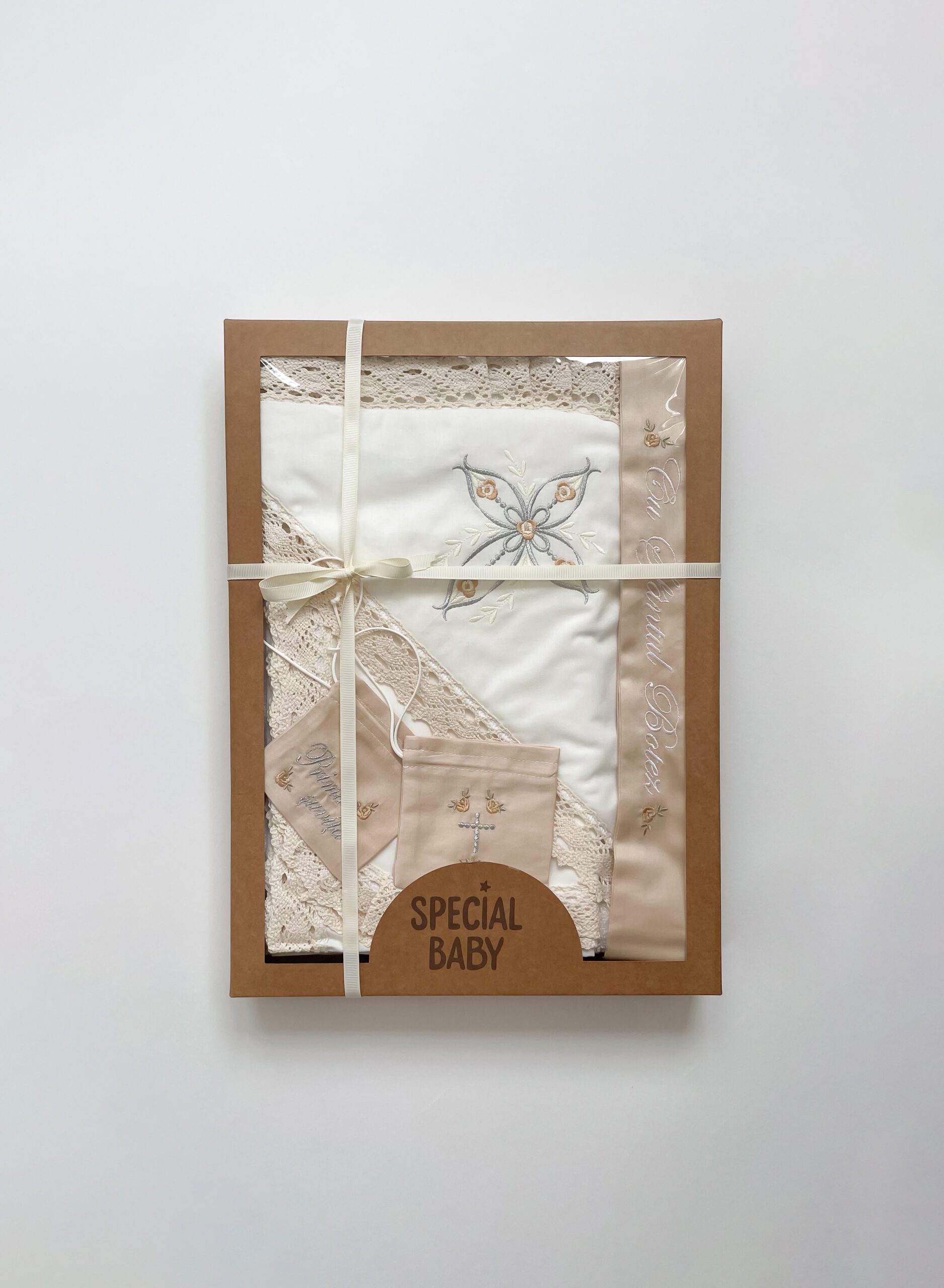 La Specialbaby, suntem dedicați aducerii unei note de rafinament și semnificație speciale ceremoniei de botez a bebelușului dumneavoastră. Înțelegem cât de important este acest moment în viața voastră și a micuțului vostru, așa că am creat cu grijă și pasiune o colecție de seturi pentru botez care să reflecte acest moment unic. Setul conține 4 piese de bază.